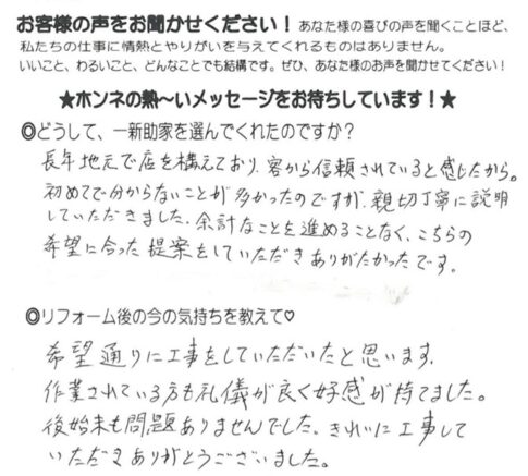 お家のリフォームや修理は、多くの方にとって不安が伴うものです、だからこそどんな小さなことでも気軽に相談でき、困った時にすぐに顔を思い浮かべてもらえる存在でありたいと考えています。