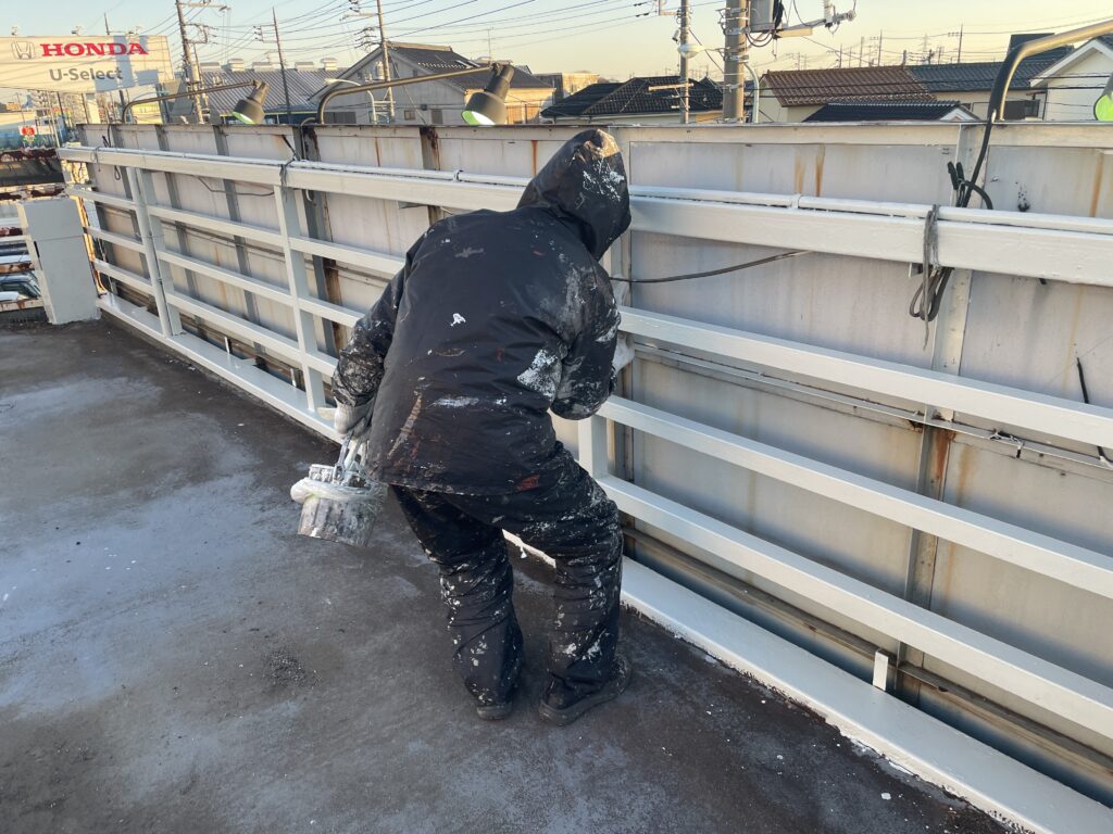 写真は、屋上部分の鉄製手摺の塗装作業の仕上げの様子です。