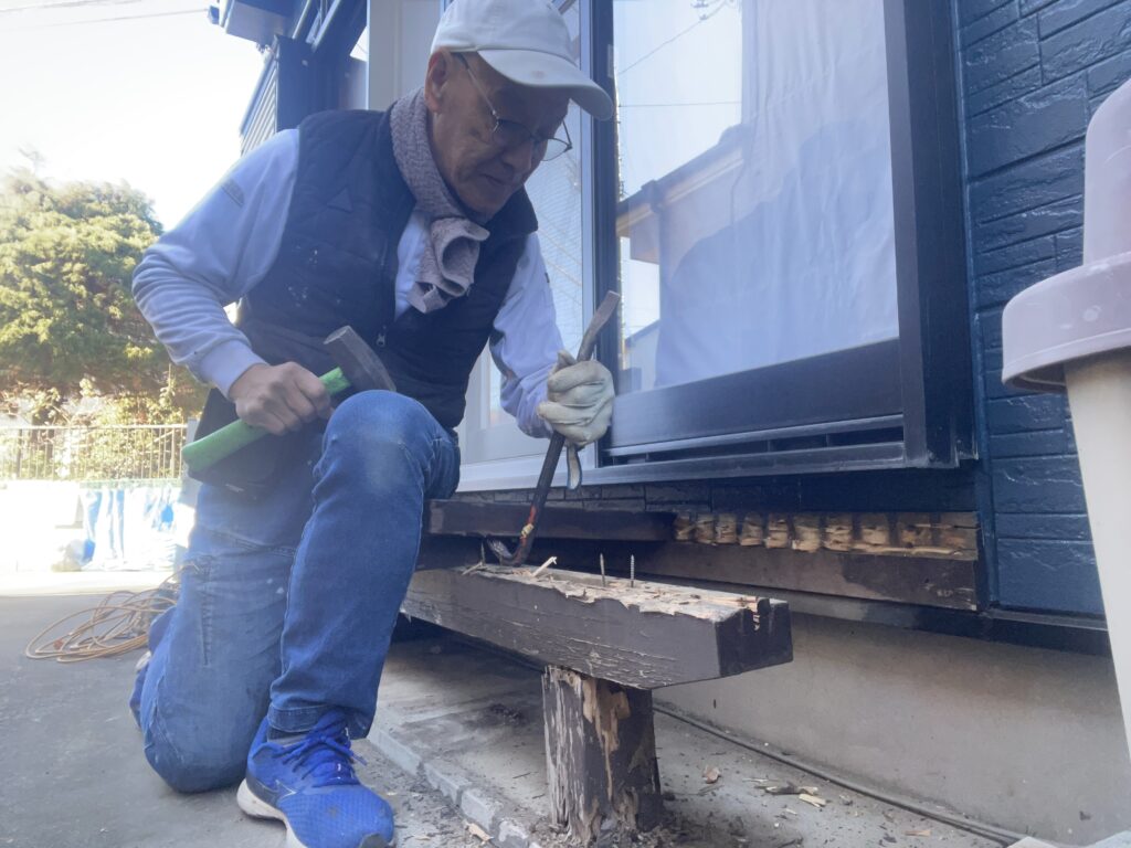 濡れ縁の3本の柱のうち右の一本もシロアリ被害にあいました。そんなこともあり、傷んだところを切断して濡れ縁を短くしてそこにストッカー(物入れ)を置くというご予定です