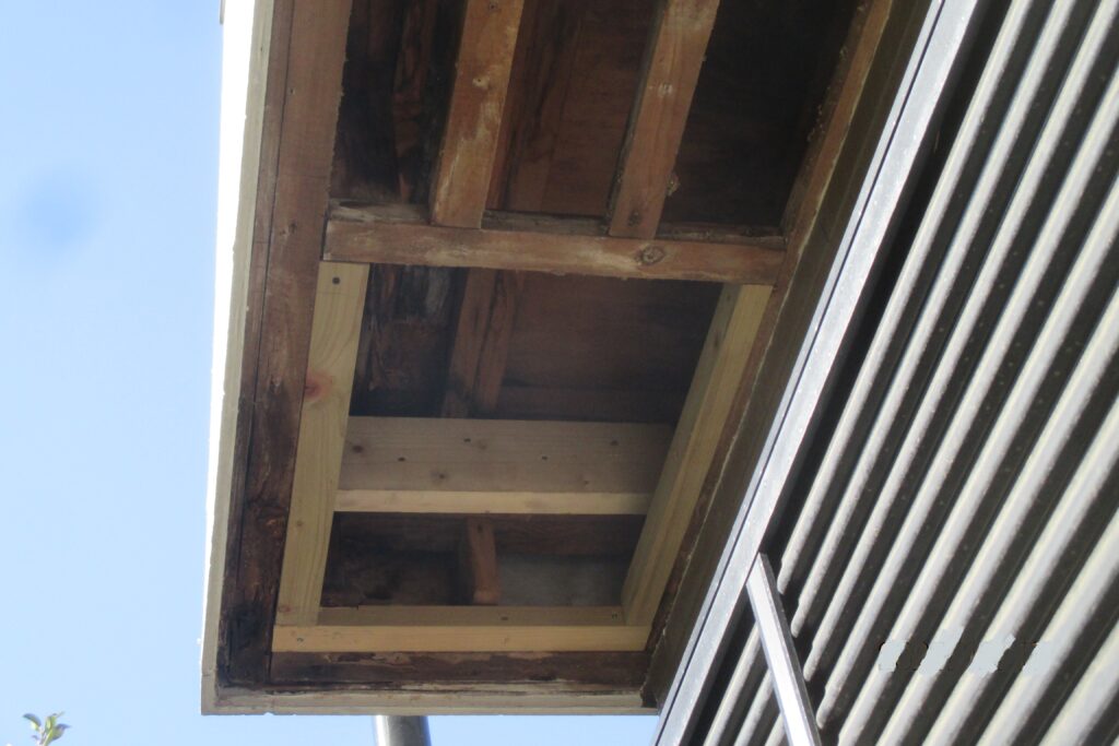 以前にも一度修理したようですが、このように軒天井が痛むのは水漏れや湿気が影響している場合が多いです、ベランダ側のFRP床には排水のドレンがあり、そのあたりの漏れが原因かもしれません。