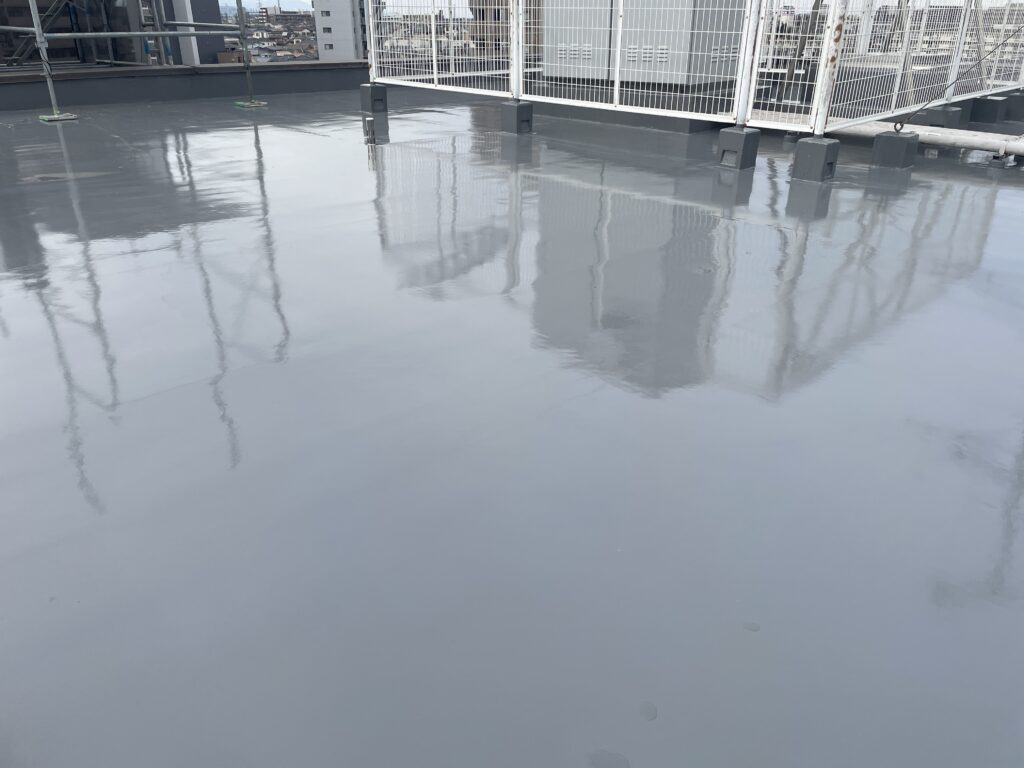 ビルの屋上防水工事が完成しました。既存の傷んだ屋上は雨漏りも発生していました、既存の脱気マット(防水塗装の下にあるシート)も全面すべて剥がし、新しいものに張替えその上にウレタン防水施工のため工期は長くなりました。