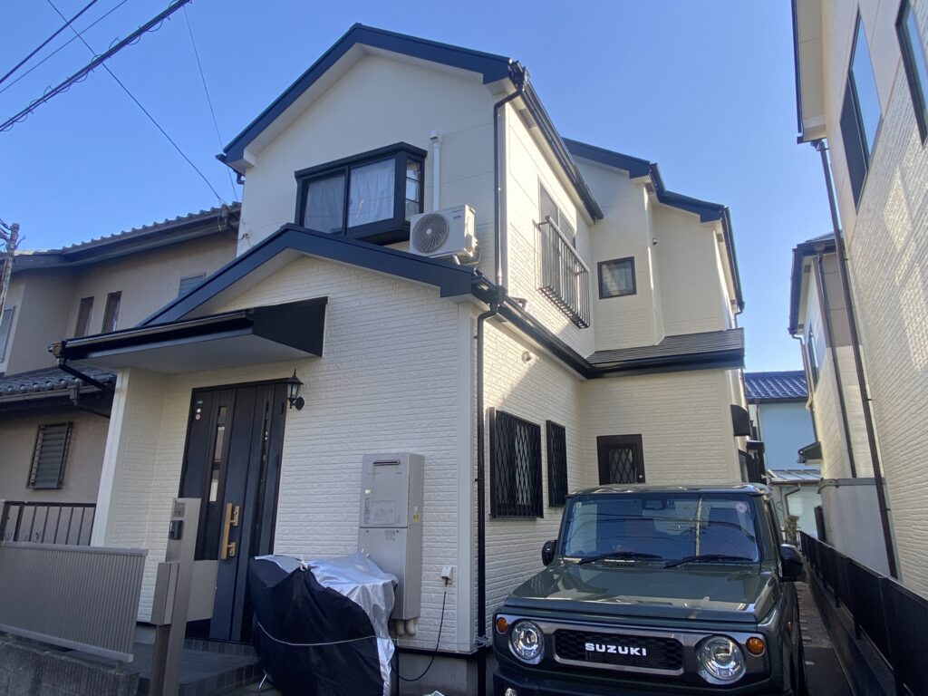 | 使用した塗料 | 【外壁】 アステックペイント:超低汚染リファイン1000Si-IR 色:8092 ニュートラルホワイト 【屋根】 アステックペイント:スーパーシャネツサーモSi 色:9119トゥルーブラック |