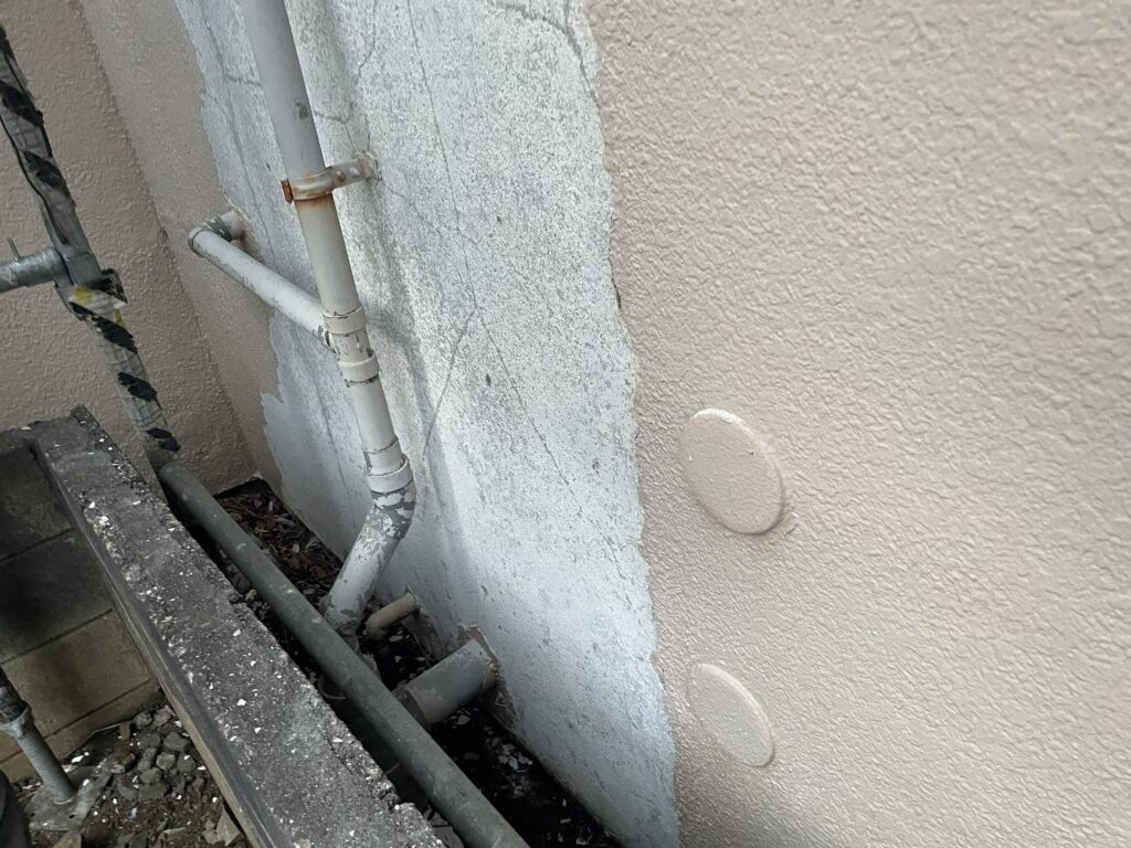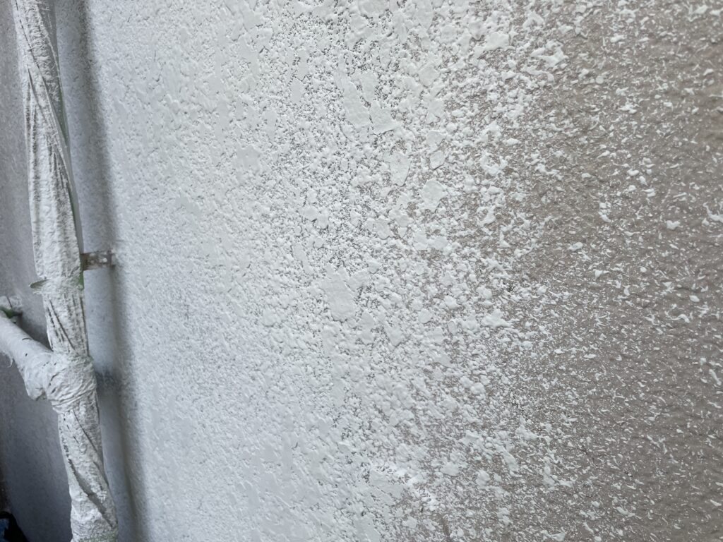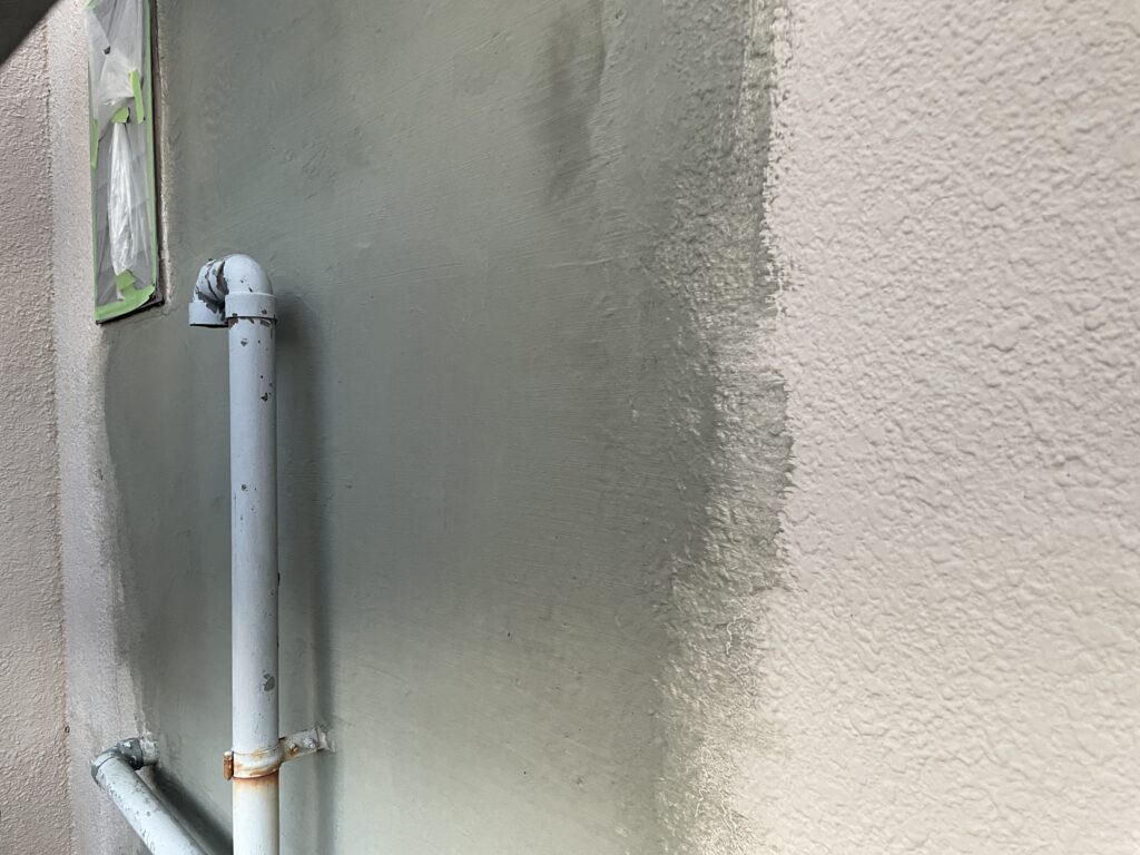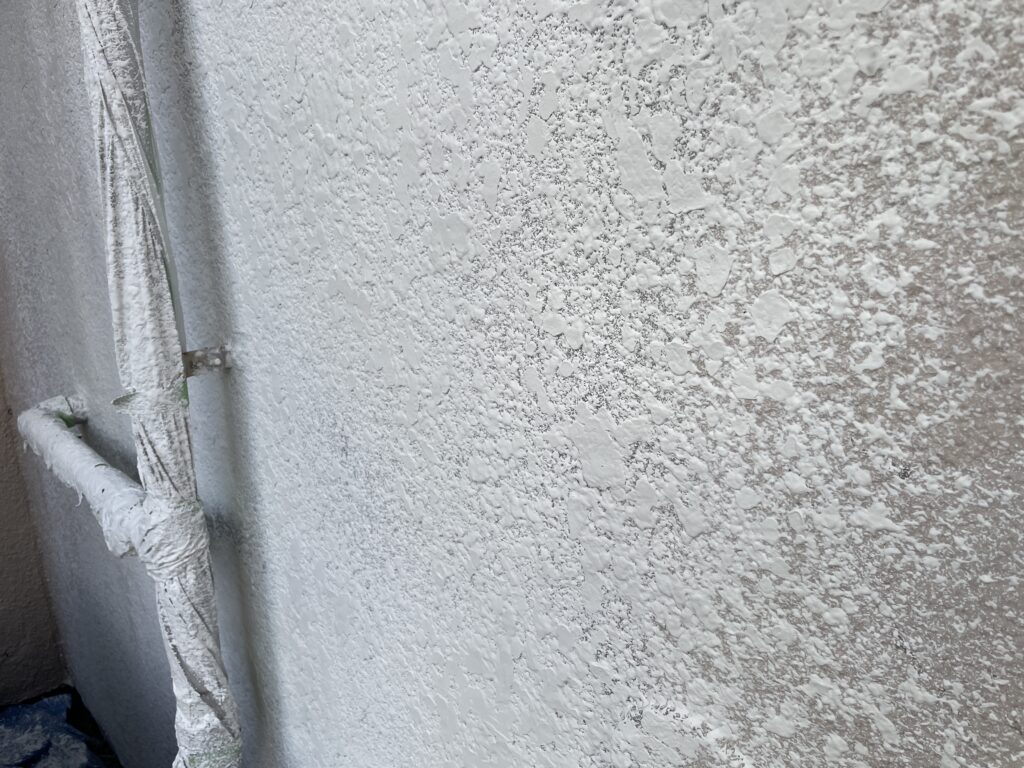 本日は、塗り替え中の現場で傷んだ外壁の修理(模様付け)を行いました。