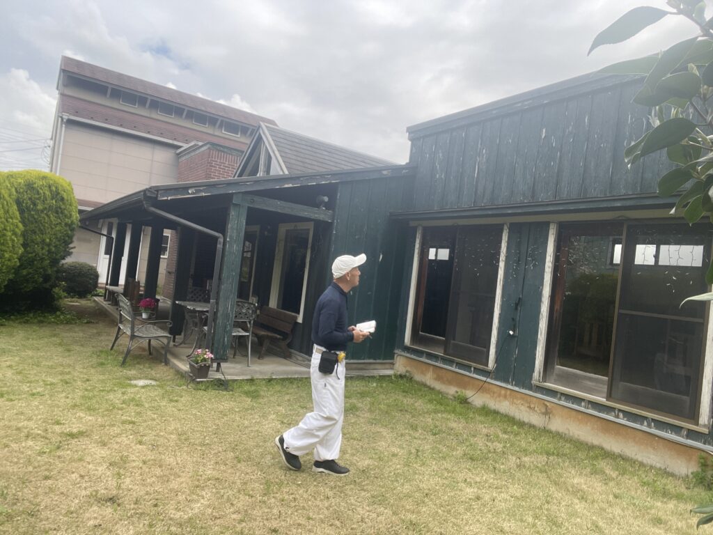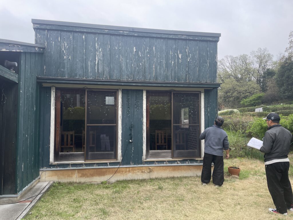 まず確認するのは、見た目ではなく劣化の中身です。今回の建物は半分は木部外壁のため、塗膜の剥がれ、木材の痩せや反り、下地まで傷んでいる箇所の有無を重点的にチェックします。