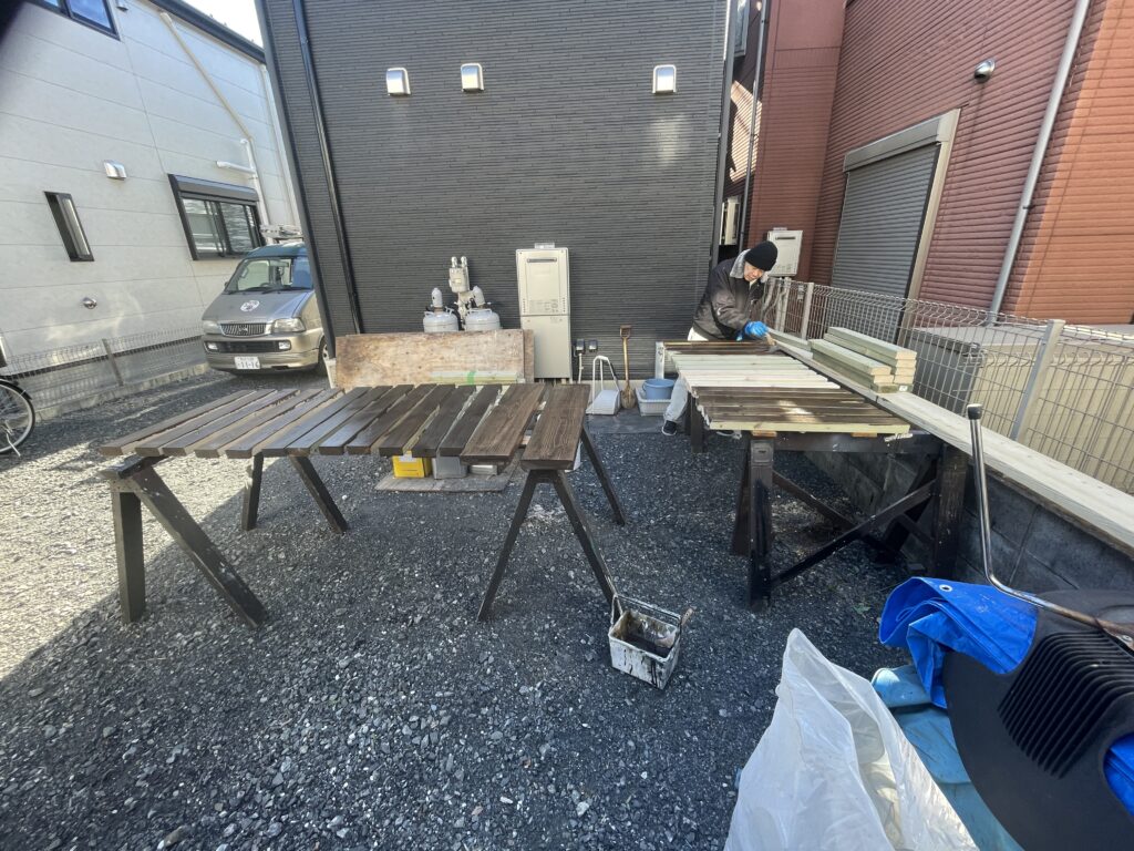 本日はは日曜日ですが来週火曜日よりのウッドデッキ交換前の下準備、材料の木材を塗料キシラデコールでの塗装をたすけの置き場にて行いました。