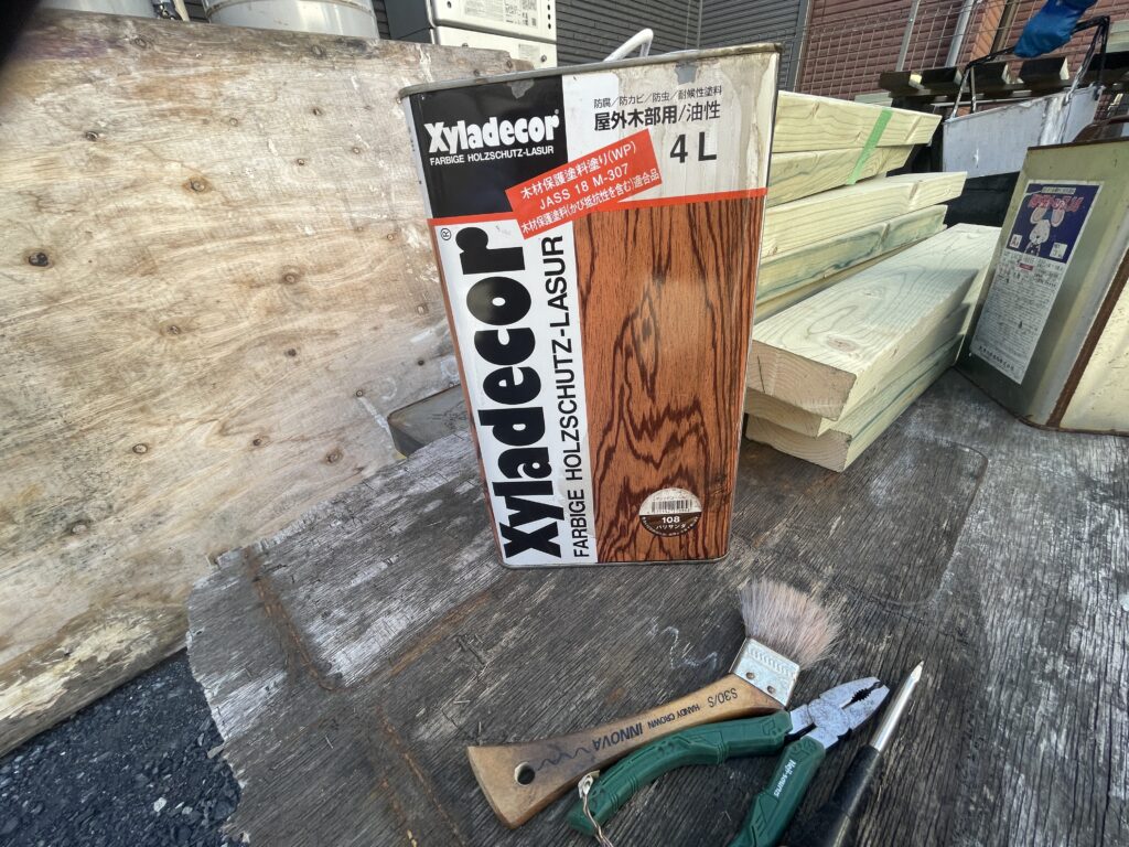 本日使用した塗料は、木部保護塗料の定番 「キシラデコール」 です。キシラデコールは、防腐、防カビ、防虫の効果をもつ屋外木部専用の浸透型塗料です。